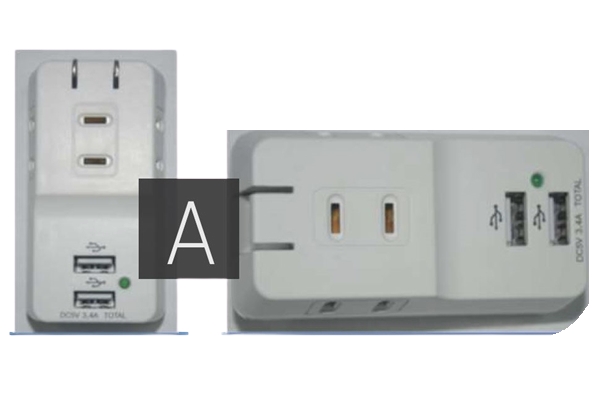 USB出力5V 3.1A(2PORT TOTAL) AC 2口(正面/上面)14A 100V 耐トラッキング 固定プラグ ニッケルプラグ刃 パッケージ:ブリスタ-+台紙 |