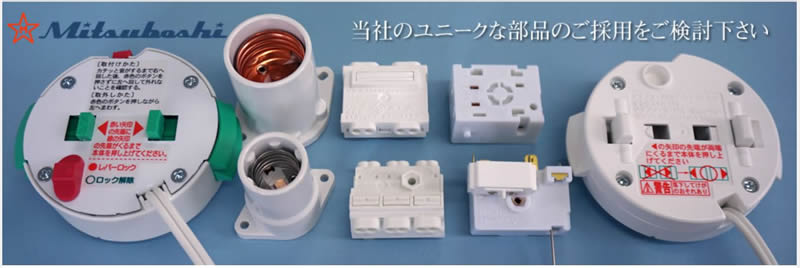 配線器具関連 配線器具関連 ・ 照明器具用ソケット、スイッチ、端子台、シーリング、電球・ 組立プラグ・コネクタ、タップ類、テーブルタップ、中間スイッチ・ 工事用配線器具 取扱メーカー 青山電陶株式会社 https://www.aoyama-d.co.jp/ 株式会社明工社 https://www.meiko-g.co.jp/ 大和電器株式会社 https://www.yamatodenki.com/ 株式会社三ッ星電器製作所 https://www.mitsuboshi-elec.co.jp/